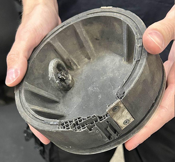 W locie HEXY 5 komora z PA12 + 15CF zadziałała zgodnie z projektem: na pułapie 10,5 km nastąpił zapłon ładunku, spadochron został wypchnięty i poprawnie napełnił się powietrzem. Na zdjęciu widać pęknięcie, powstało ono już po zakończeniu misji, gdy niewyhamowana komora uderzyła w grunt. Przy testach statycznych na ziemi nie było potrzeby drukowania kolejnych komór dzięki czemu został zaoszczędzony czas oraz zredukowano koszty konstrukcji.